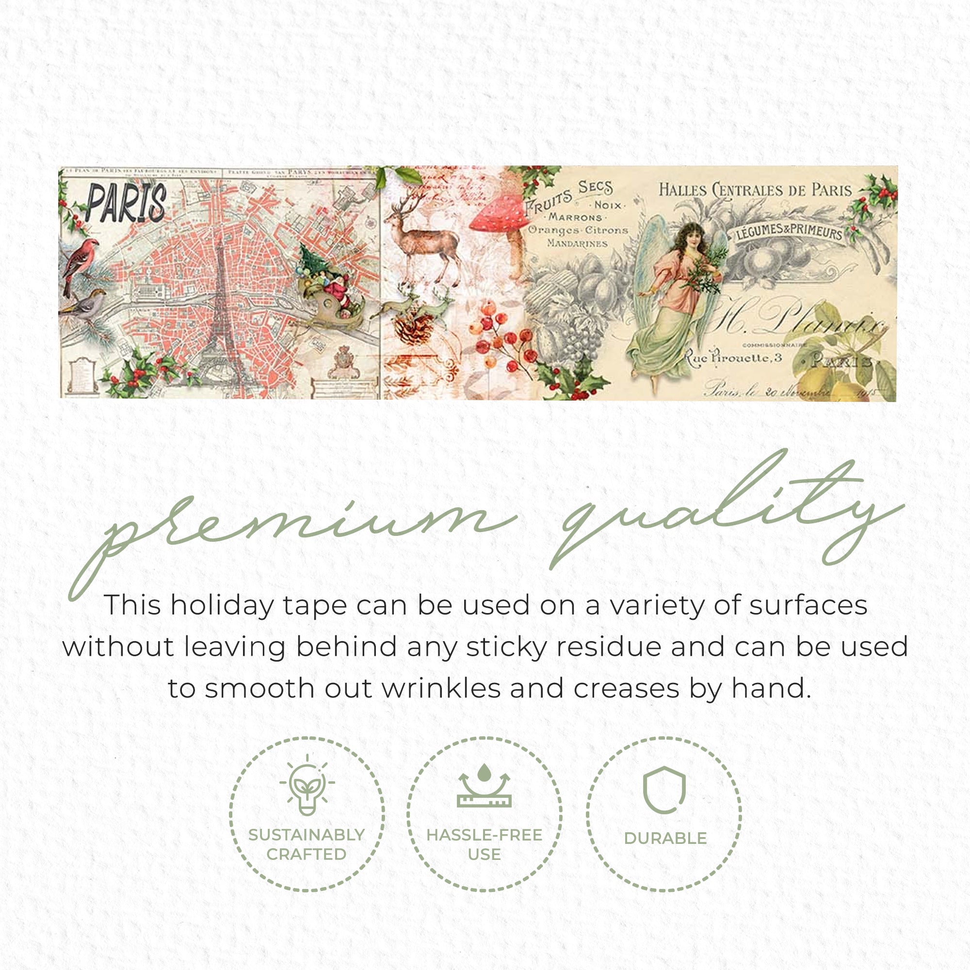 ✅Material Quality: The winter vintage Christmas in Paris washi tape evokes memories of a festive season in the city of lights! Our washi tapes are durable but still easy to tear, waterproof, reusable, and has a secure bond when applied. This holiday tape can be used on a variety of surfaces without leaving behind any sticky residue and can be used to smooth out wrinkles and creases by hand.